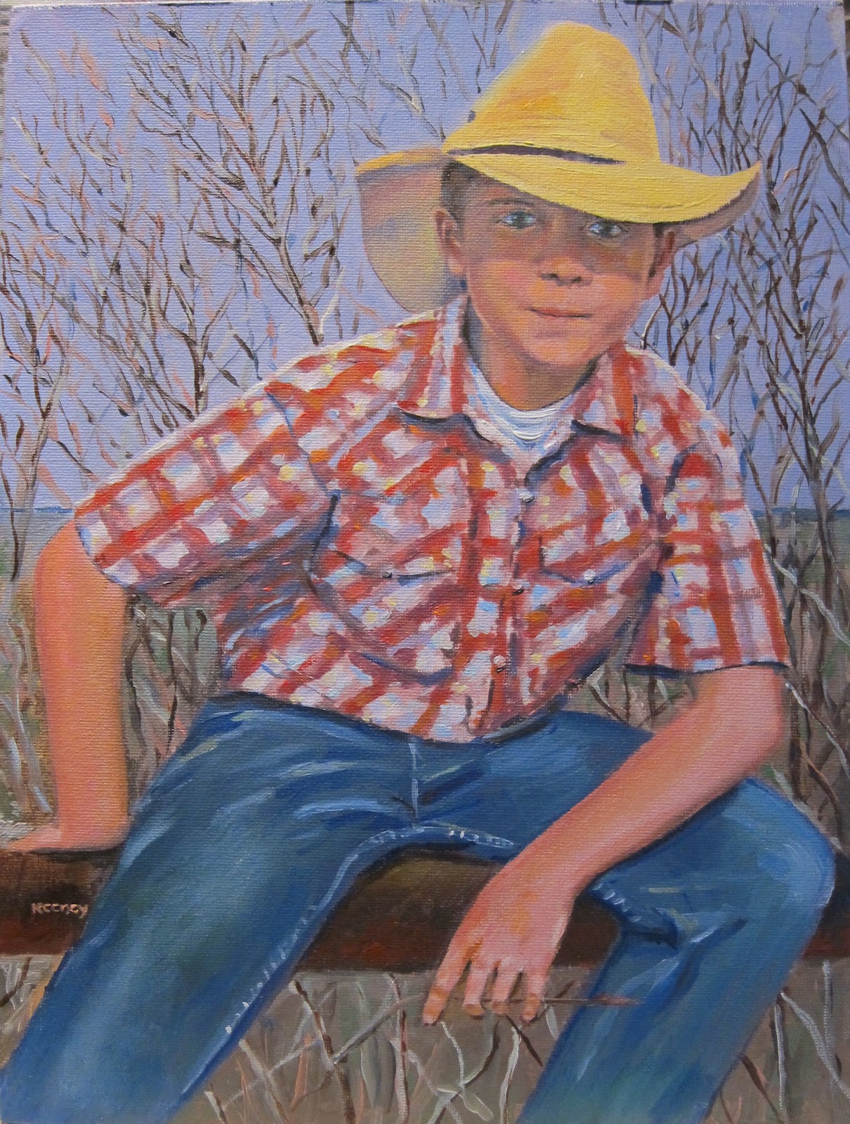 I painted this from a photo taken by my sister of her grandson. I like the idea that he's breaking out of the picture, plus the dynamic tension that comes from being off balance. Making the branches look real was a challenge.